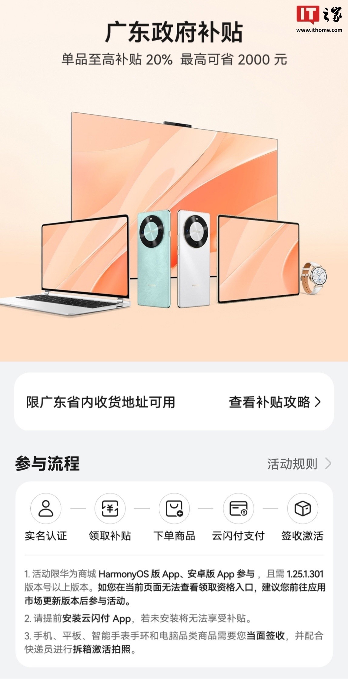 IT之家 2 月 14 日消息,华为宣布旗下华为商城 HarmonyOS 版 App 和安卓版 App(要求 1.25.1.301 及后续版本)现已接入广东省国补接口,页面称相应广东政府补贴仅限广东省内收货地址可用,单品至高补贴 20%,最高可省 2000 元。